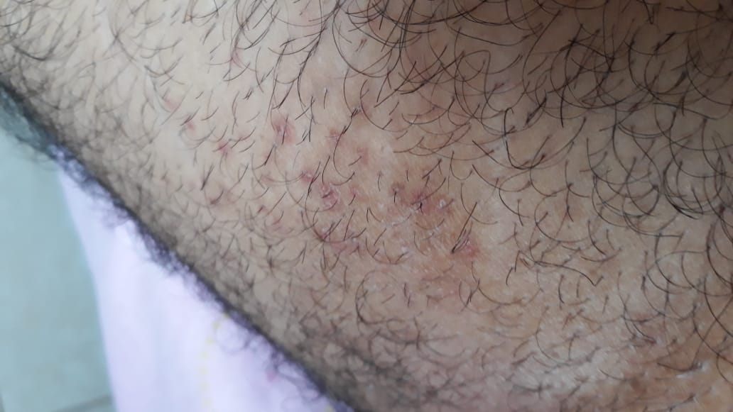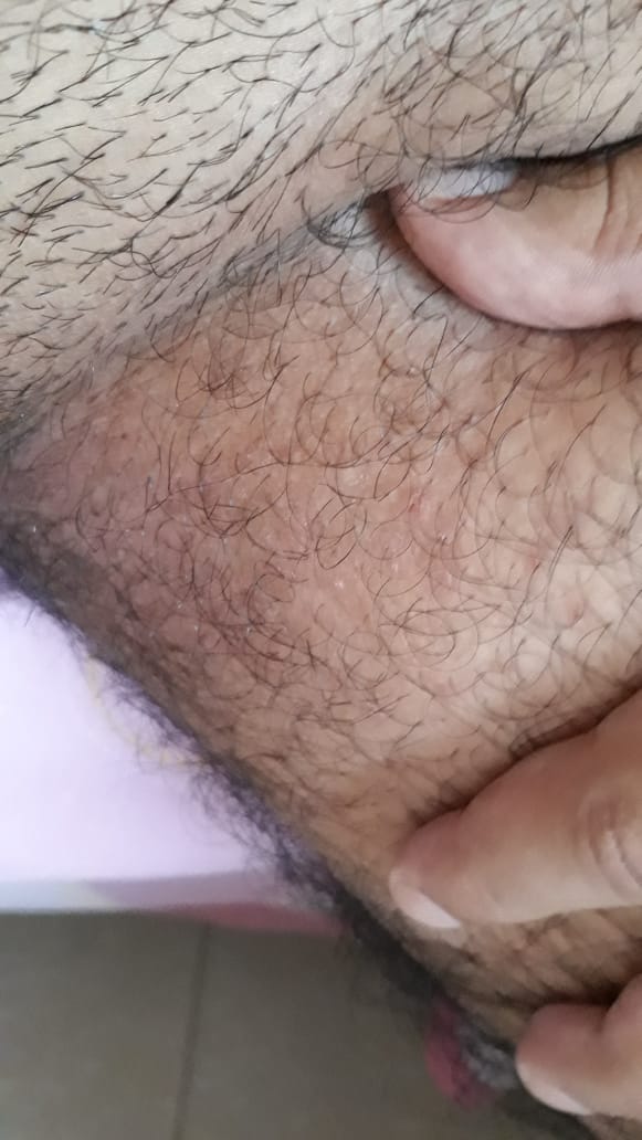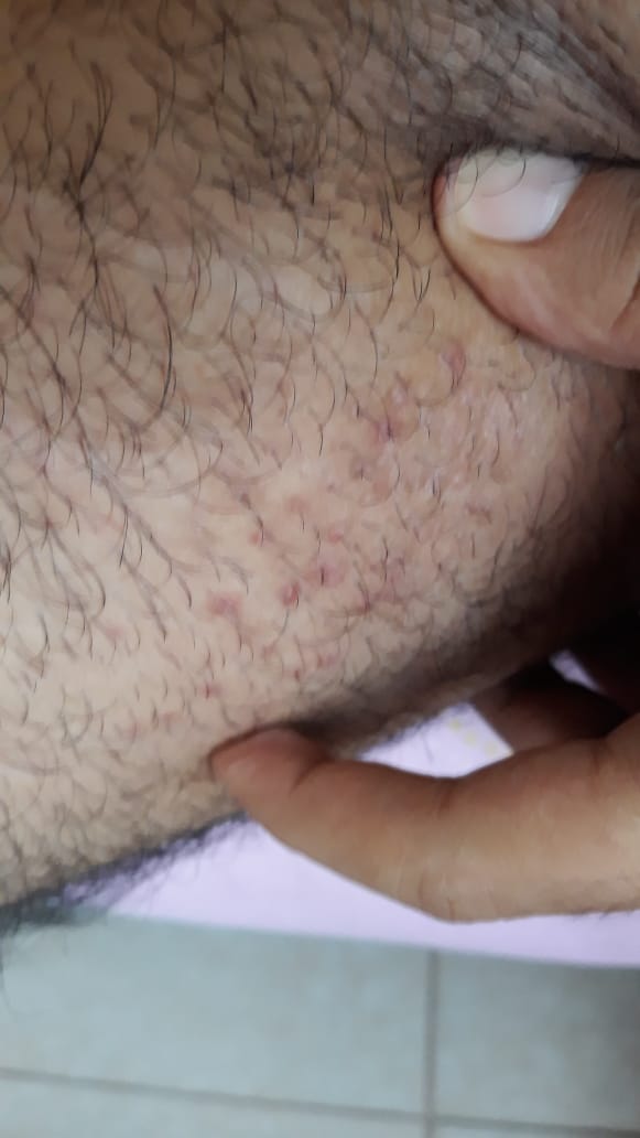 Hoy 29 de marzo mas de un mes despues de la ultima relacion sexual que comenté anteriormente en estos días habia sentido irritación (se me habia como pelado una pequeña parte y por eso ardía) en la pierna (la zona junto al pene) me puse alcohol un día y al siguiente ya estaba cicatrizado. hoy me reviso bien toda esa zona y me doy cuenta que tengo estos granitos de los que adjunto la foto no en la misma zona de la irritación de antes sino más a la derecha y en la otra pierna también pero es menos y no tuve ningun tipo de irritacion ahi.